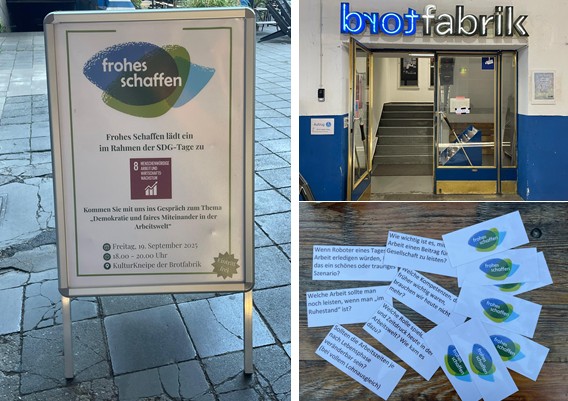 Am 19. September 2025 haben wir uns von 18 bis 20 Uhr mit einer Veranstaltung an den Bonner SDG-Tagen beteiligt. Im Biergarten der KulturKneipe Brotfabrik haben wir uns über Demokratie & Faires Miteinander in der Arbeitswelt ausgetauscht. In kleinen Gruppen haben wir über Erfahrungen, Bedürfnisse und Vorstellungen zur „Guten Arbeit“ disktutiert. Es war ein sehr…