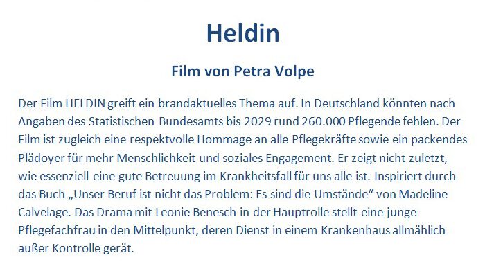 Am 28.März 2026 haben wir uns nachmittags im Kulturzentrum Altes Rathaus, ZOK 720 ‚Kneipe für alle‘, in Bonn Oberkassel den Film ‚Heldin‘ von Petra Volpe angeschaut. Zu diesem ersten Filmevent in der zok720 kamen ca. 20 Interessierte, die anschließend in kleinen Gruppen den Inhalt diskutiert und die Arbeit der Pflegekräfte gewertschätzt haben.